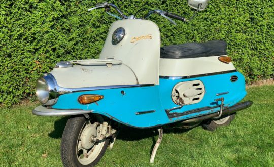 Skútr Čezeta 502 ve vývozním či tuzexovém provedení s typicky orientovanými zadními blinkry. Motocykl přivezen z Německa, přihlášen na Českých standardních dokladech. Stroj po starší velice zdařilé renovaci, plně funkční prakticky bez dalších investic. Drobné kosmetické nedostatky vlivem času a používání.